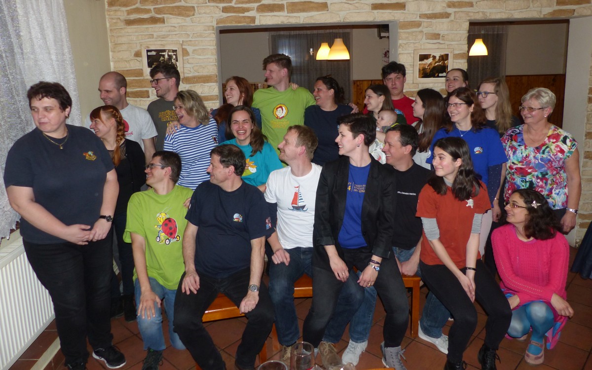 |  Kdo tu všechno byl. Všimněte si vzpomínky na táborová trička. Sešlo se jich čtrnáct ze sedmnácti možných. | |