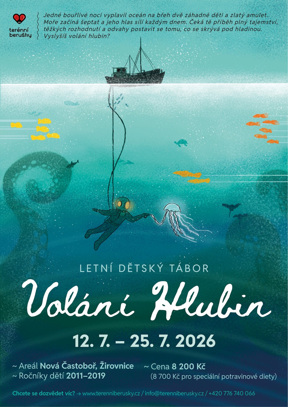 25. 1. 2026 - upoutávka k celotáborové hřeNěkterá města žijí z moře. Jiná se ho bojí. A pak jsou taková, kde se obojí začíná nebezpečně prolínat. Po jedné strašlivé bouři moře vyplavilo na břeh dvě neznámé děti a podivný zlatý amulet. Od té doby se vlny chovají jinak a lodě už nemohou vyplouvat na moře bez strachu, že je hlubiny pohltí. Možná je to jen pověra… a možná začátek příběhu, do kterého brzy vstoupíš i ty. Celotáborová hra Volání hlubin tě zavede do světa odvážných námořníků, podivínských učenců, zapomenutých legend a tajemství, která měla zůstat skrytá pod hladinou. Čeká tě léto plné napětí, objevování a rozhodnutí, která nebudou vždy jednoduchá. Naučíš se, že odvaha nemá jen podobu taseného meče, ale i schopnost postavit se sám sobě a překonávat svoje vlastní hranice. Společně s ostatními se staneš součástí příběhu, který se bude psát přímo před tvýma očima. Až se moře znovu ozve, bude jen na tobě, jestli jeho volání vyslyšíš. Jirka P "Tukan"